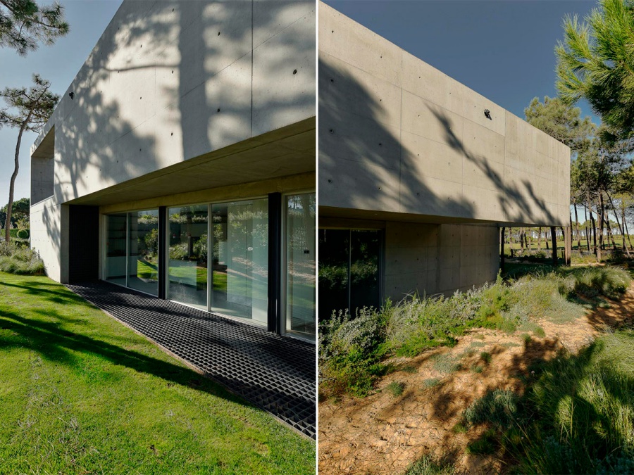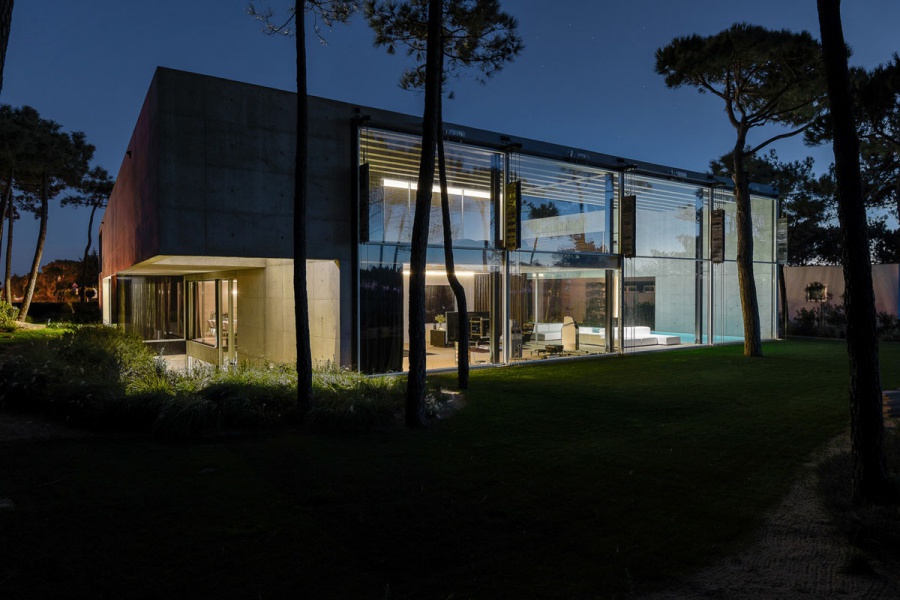 Không gian tầng 1 được kết nối hài hòa với thiên nhiên nhờ tường kính kết hợp với từng khối bê tông.