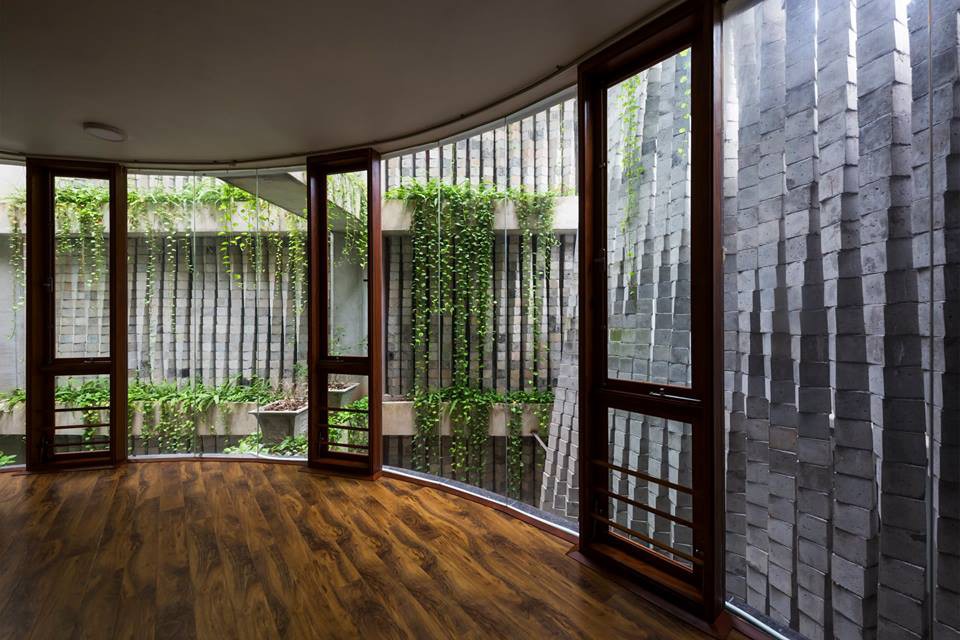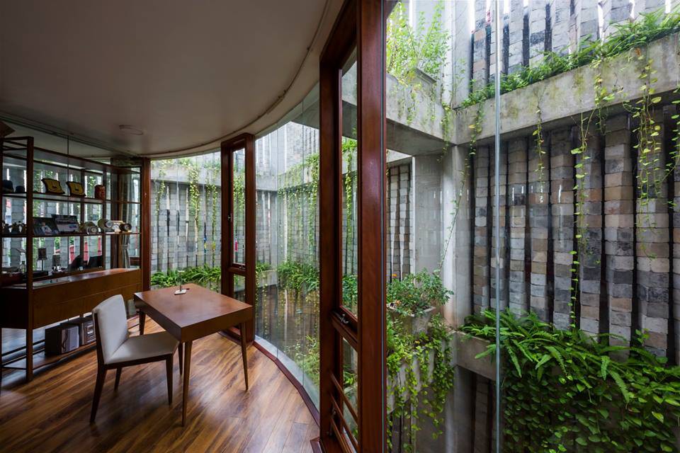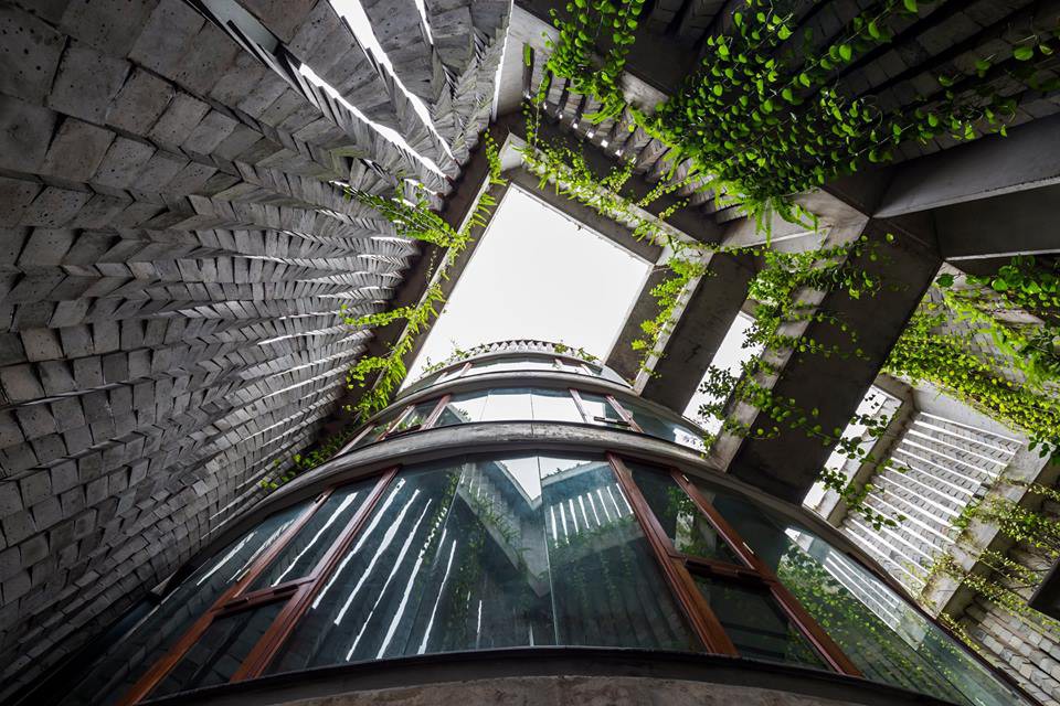 Vì đã kiến tạo một bức rèm bê tông bao bọc bên ngoài nên khối nhà sinh hoạt của gia chủ được thiết kế hình khối trụ tròn cao bốn tầng. Thiết kế đặc biệt với tường kính toàn bộ giúp các thành viên trong nhà tận hưởng được thành quả từ sự táo bạo dám làm của mình.