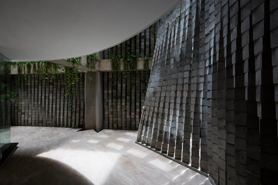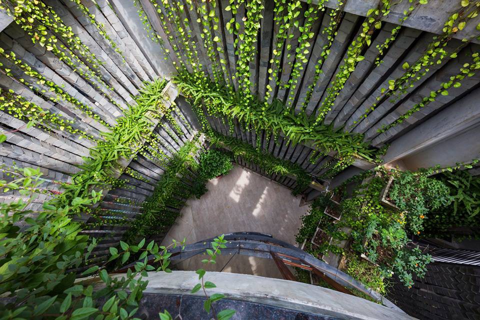 Chẳng những thế, khoảng hở của trụ đá còn rất tuyệt vời để cho cây leo phát triển. Nhìn những cât leo xanh mướt mải vươn mình phủ xanh những khối bê tông, khiến người ta liên hưởng đến hình ảnh đá nở hoa. Đấy ai bảo cứ bê tông là cứng nhắc, khô khan nào. Hơn thế nữa, khe hở của những trụ bê tông cùng cây xanh còn lý tưởng để cho những loài côn trùng nương náu, kéo thiên nhiên lại gần hơn cho ngôi nhà.