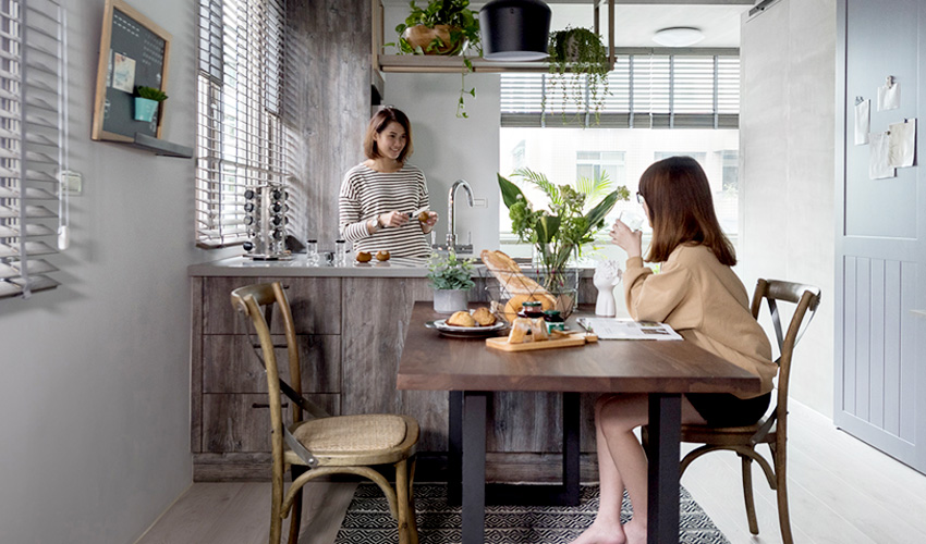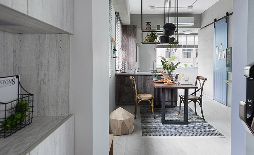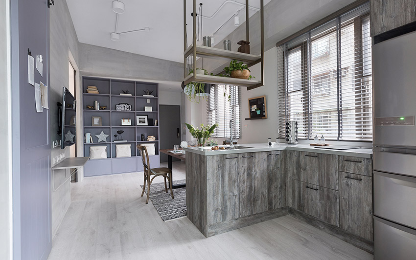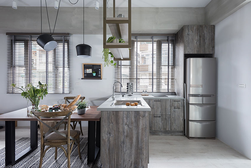 Tiếp nối với khu vực tiếp khách, ăn uống là nơi bố trí tủ đựng bếp tiện với gỗ màu ghi xám đậm hơn tông xám của tường và sàn nhà.