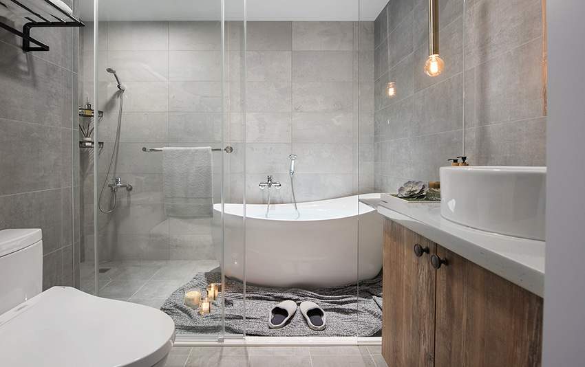 Phòng tắm rộng rãi với sự phân tách hai khu vực chức năng bằng cửa kính trượt. Mọi người có thể tận hưởng bầu không khí trong lành bên trong vẻ đẹp sang trọng và hiện đại của phòng tắm. Chỉ lựa chọn những gam màu đơn giản nhất, tiếp nối màu sắc của các khu vực bên ngoài nhưng vẫn đủ để mang đến nét đẹp quyến rũ, đáng yêu cho không gian.