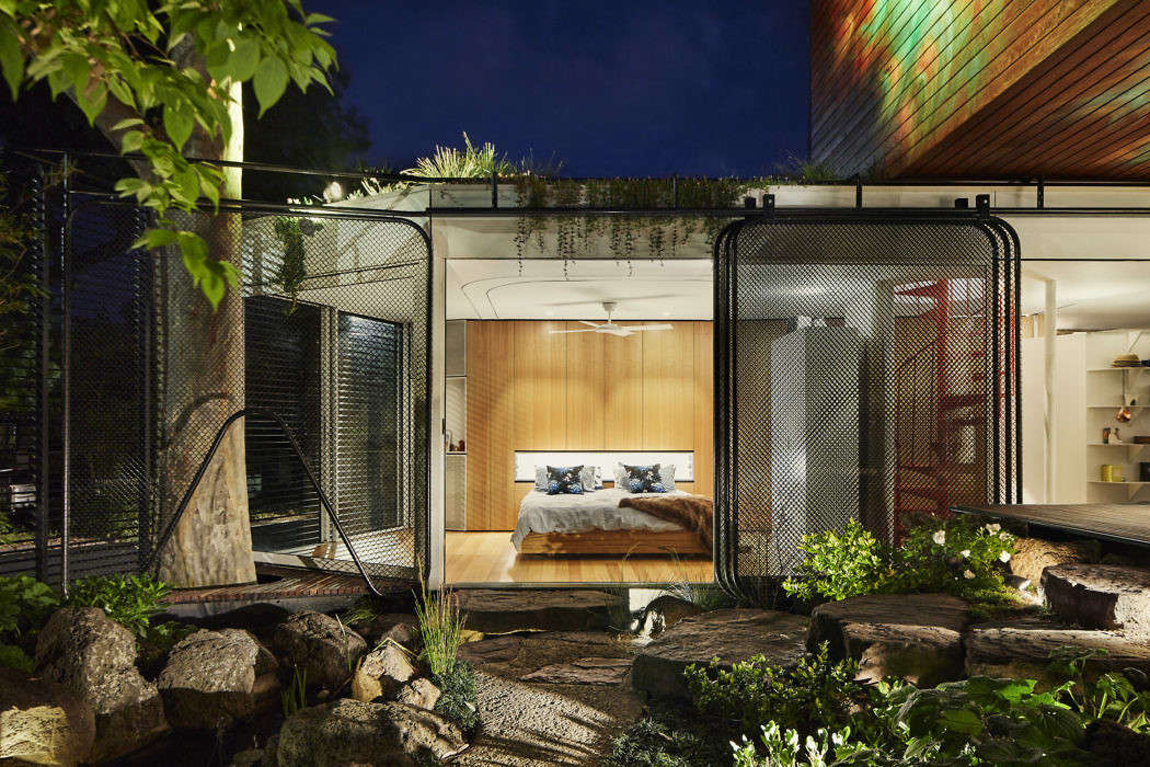 Khi màn đêm buông xuống khung cảnh của ngôi nhà rất đẹp mắt và gần gũi với thiên nhiên. Một bức tường ở tầng hai được phun màu lại là điểm thu hút.