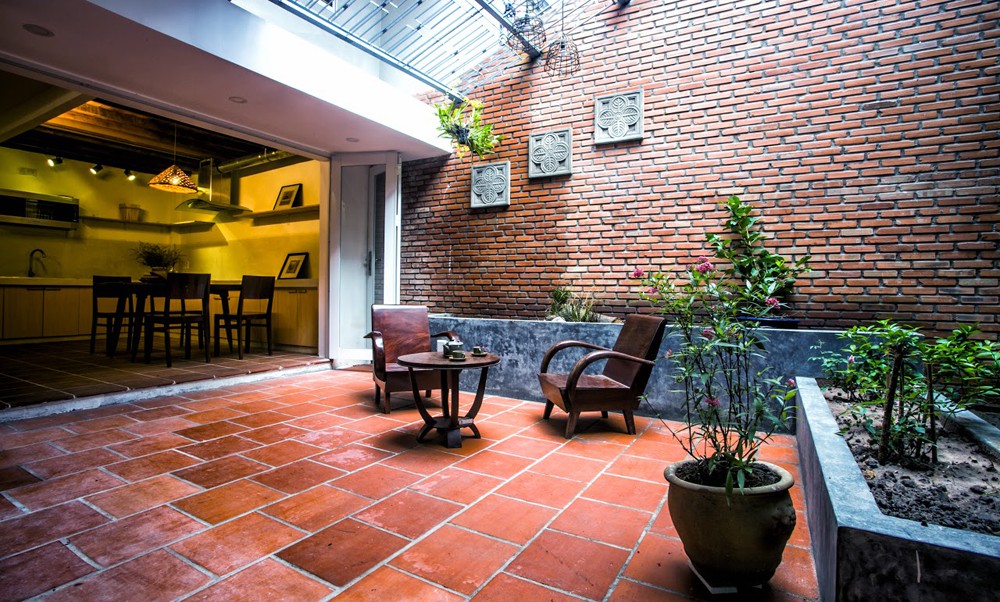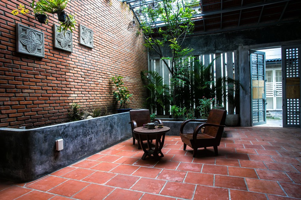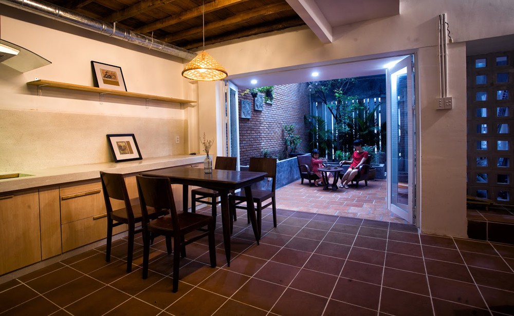 Có thể nói khoảng sân với phần mái nửa kín, nửa hở này là một cách xử lý không gian đầy tinh tế của kiến trúc sư. Nếu khoảng giếng trời ở phần hở giúp khoảng vườn với cây xanh được hưởng trực tiếp nắng gió để sinh trưởng tự nhiên nhất, thì phần kín đảm bảo cho nhu cầu sinh hoạt của gia chủ trong điều kiện thời tiết mưa nắng khắc nghiệt.