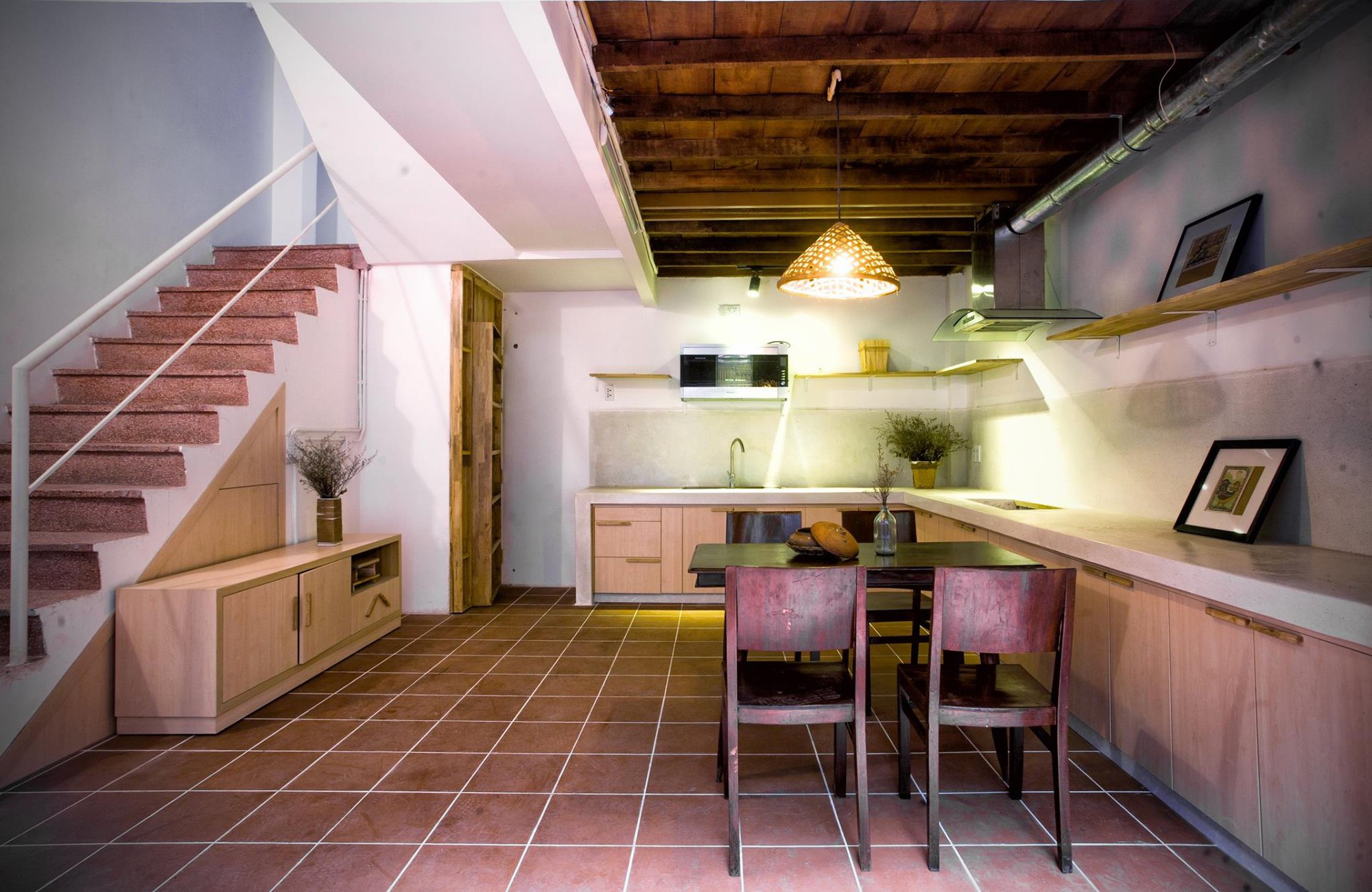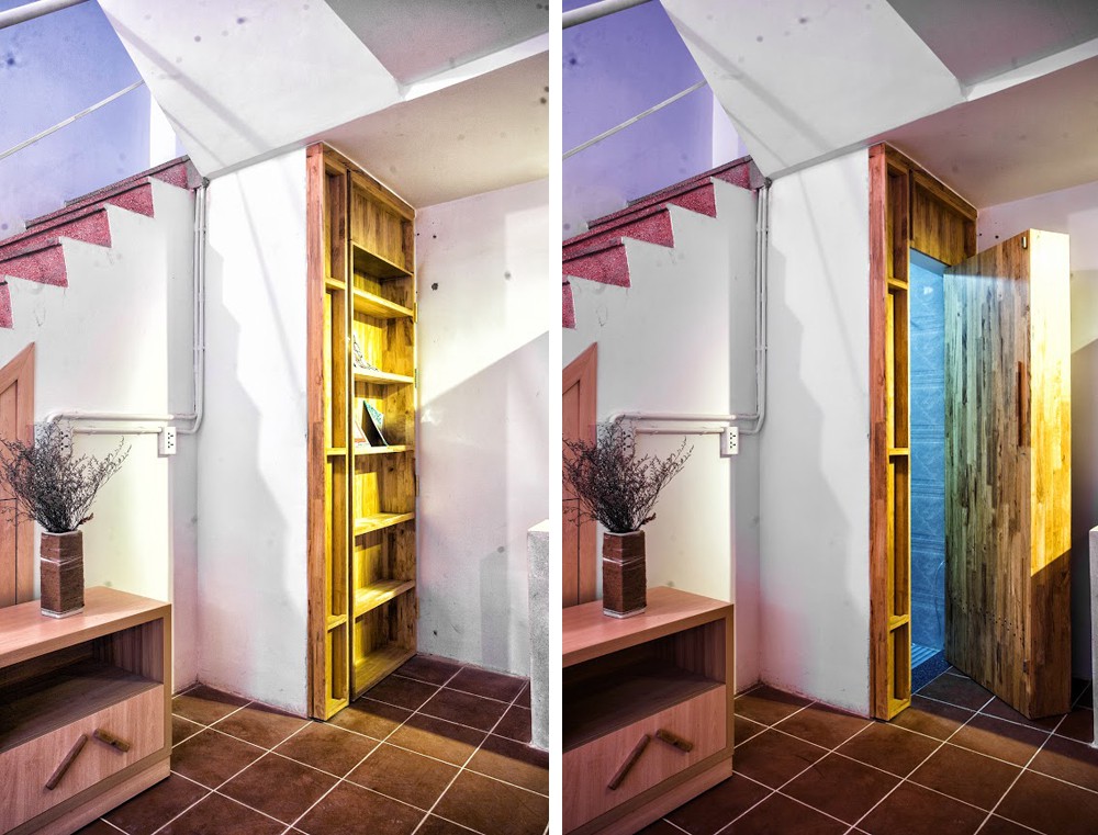 Trong không gian sinh hoạt, các KTS gần như giữ nguyên lại khung nhà chỉ thay mới nội thất để đáp ứng được nhu cầu sinh hoạt hiện đại. Quan sát trong khối nhà cũ sau cải tạo, ta sẽ thấy ngay sự giao thoa của cái cũ và cái mới. Chẳng hạn gầm cầu thang được đóng thêm hệ kệ thành kho đồ, cửa nhà vệ sinh thêm công năng của một giá đồ. Khu bếp - ăn được thiết kế hiện đại với hệ tủ bếp kiêm tủ lưu trữ nhỏ gọn mà đủ hiện đại, tiện dụng.