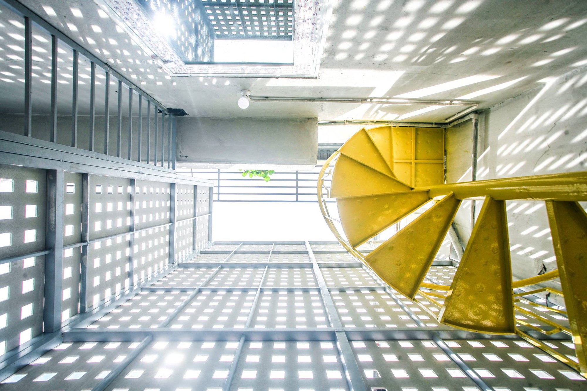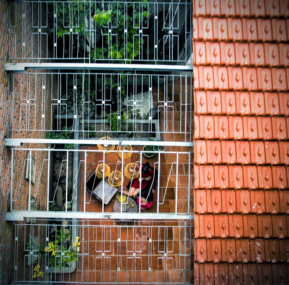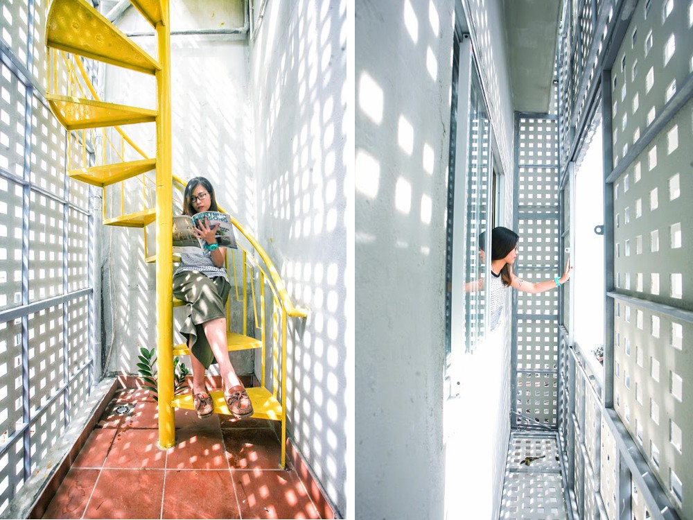 Không gian thú vị hơn cả ở khối nhà ở phải kể đến không gian tầng trên. Vấn đề lớn nhất của khối nhà này là phải đối mặt trực tiếp với nắng hướng Tây. Để giải quyết vấn đề này, KTS đã thiết kế một bức tường lỗ bằng chất liệu prima giúp giảm nhiệt lượng cũng như ánh nắng trực tiếp rọi vào nhà. Đặc biệt hơn nữa, bức tường này còn mang đến tính thẩm mỹ và ấn tượng cho mặt tiền ngôi nhà.
