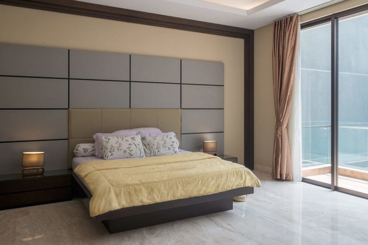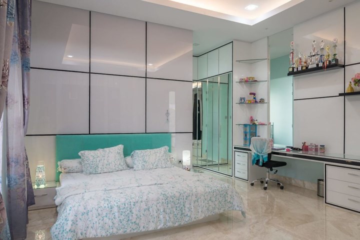 Trong khi đó phòng ngủ chính được đầu tư nhiều sản phẩm nội thất tinh xảo hơn, sàn làm bằng đá cẩm thạch cùng nội thất phủ kính bóng mờ làm tăng cảm giác rộng rãi cho phòng.
