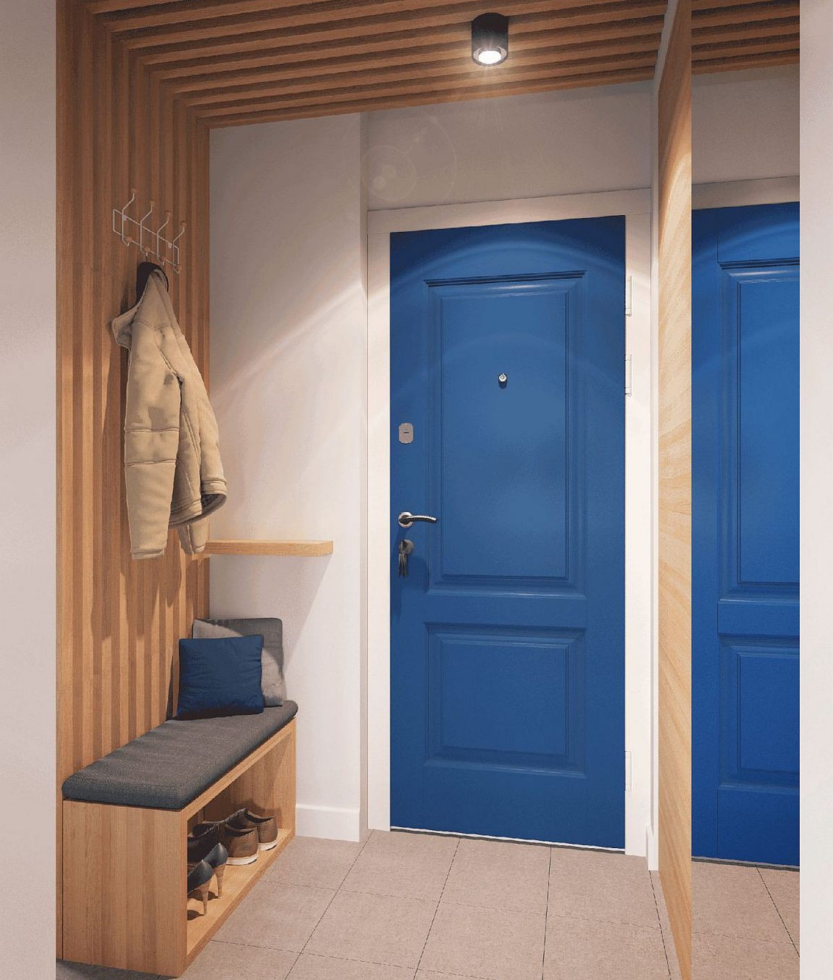 Lối cửa ra vào có các mẹo nhỏ ăn gian diện tích mà bạn có thể thấy ngay: gương cỡ lớn, kệ, móc treo quần áo và ghế ngồi đơn giản.