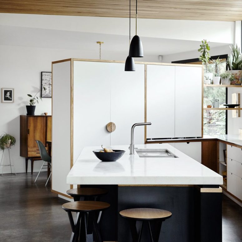 Nhà bếp màu trắng tinh khôi đủ để mọi người cảm thấy yêu hơn chốn đi về của mình. Toàn bộ nội thất chủ yếu được sử dụng chất liệu gỗ pha nhựa công nghiệp. Không gian trắng giúp căn phòng vốn nhỏ hẹp trở nên rộng thoáng bất ngờ.
