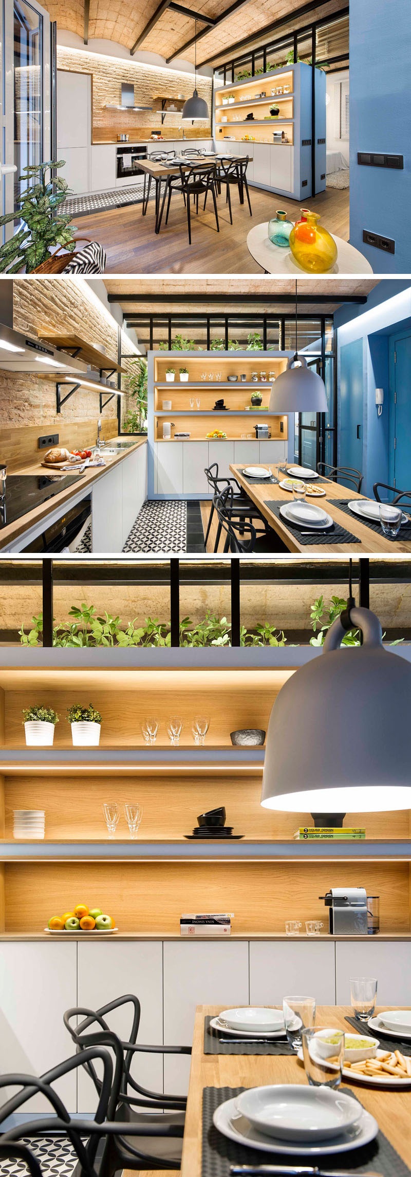 Gỗ và thép không gỉ là 2 chất liệu được sử dụng nhiều không khu vực nấu nướng của căn hộ. Sự kết hợp giữa mảng tường gạch thô cũ với chất liệu thép hiện đại và gỗ tự nhiên mang đến một không gian rất đặc biệt cho căn phòng bếp này. Hệ thống ánh sáng tuyệt đỉnh cũng là một điểm cộng trong phong cách thiết kế nhà bếp.