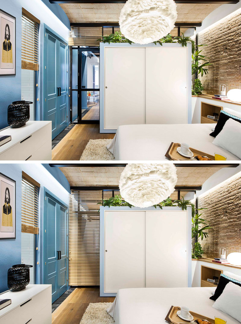 Nếu như 1 phần bức tường ngăn cách phòng bếp và phòng ngủ được dùng làm không gian lưu trữ thì phần còn lại của nó lại được dùng làm tủ quần áo. Vậy là thay vì một bức tường đơn điệu, chiếm diện tích, cách lựa chọn những chiếc tủ lưu trữ ngăn cách như thế này đã mang lại nhiều tiện ích cho người dùng.