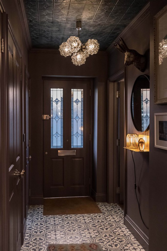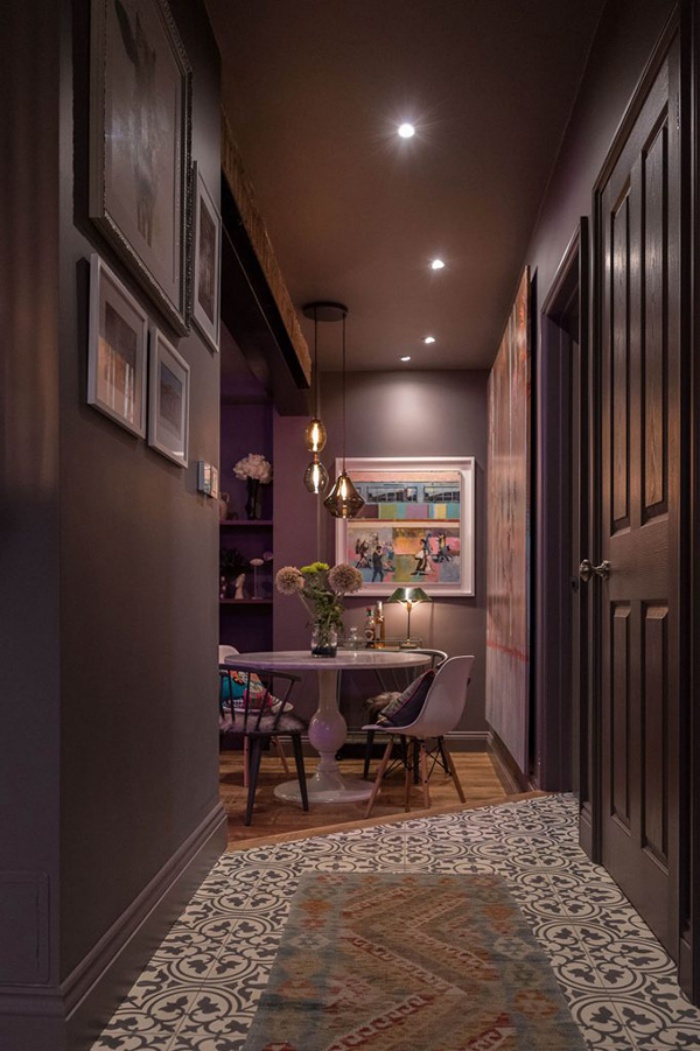Lối vào nhà thay vì chọn tông màu trung tính hay màu sáng như cách thông thường, cô gái trẻ đã “mạnh dạn” chọn màu tối. Lối vào như chứa đầy những điều mới mẻ bất ngờ nhưng cũng đầy bí ẩn. Không gian đẹp hơn với màu nâu pha chút tím tạo chiều sâu và vẻ đẹp sang trọng từ ánh sáng.