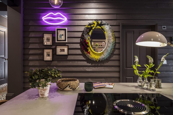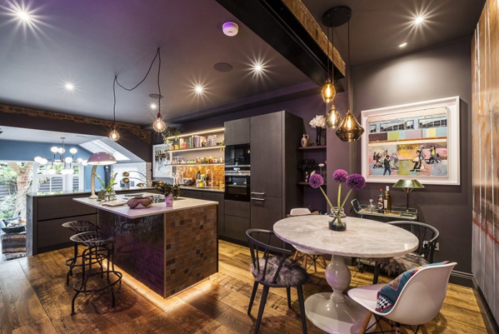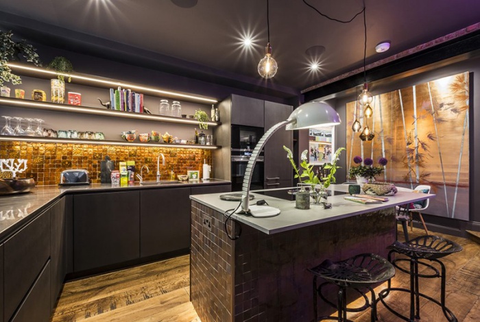 Không gian nấu nướng vô cùng ấm cúng và ấn tướng với đèn Led hỗ trợ ánh sáng gắn trên từng chiếc kệ bếp. Căn phòng màu tối nhưng vẫn đủ sáng và đẹp với điểm nhấn từ đèn chiếu nhân tạo.