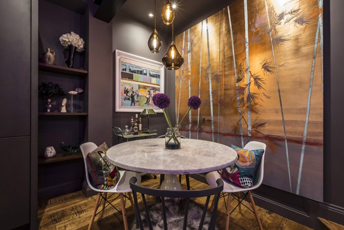 Góc ăn uống được chọn bàn ăn bằng đá cẩm thạch màu nâu sữa vô cùng sang trọng. Bức tranh nhiều màu sắc trên tường tăng thêm vẻ đẹp sinh động cùng nét tươi vui cho không gian. Những nét vẽ trên tường với tre trúc cùng ánh sáng vàng hắt lên mang lại cho căn phòng nét đẹp nghệ thuật đầy tinh tế.