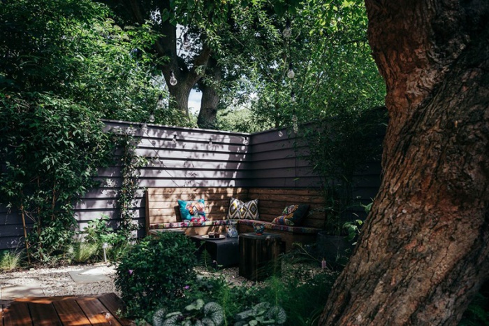 Góc vườn bên ngoài xanh mát với cây cổ thụ rợp bóng. Chủ nhân đã thiết kế thêm ghế góc bằng gỗ với những chiếc gối tựa nhiều màu sắc để tạo nên góc thư giãn ngoài trời bình yên, trong lành.