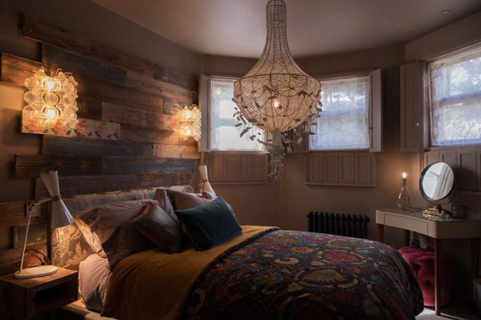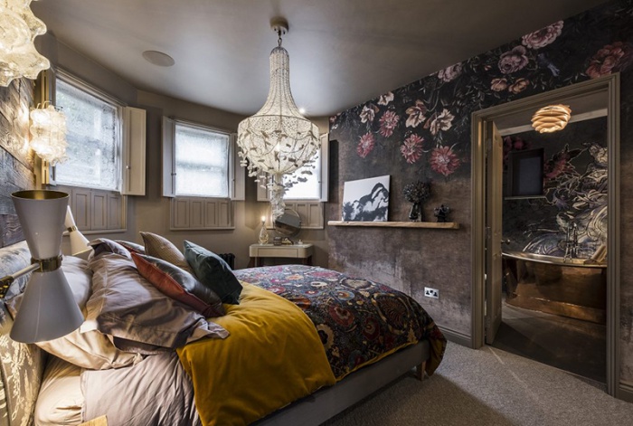Phòng ngủ thứ hai với họa tiết hoa văn trên tường làm điểm nhấn. Không gian màu trầm với cách bố trí nội thất đơn giản nhưng vẫn đủ để mọi người yêu thích góc nghỉ ngơi ngay từ cái nhìn đầu tiên.
