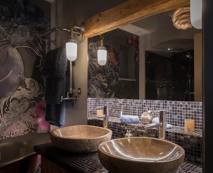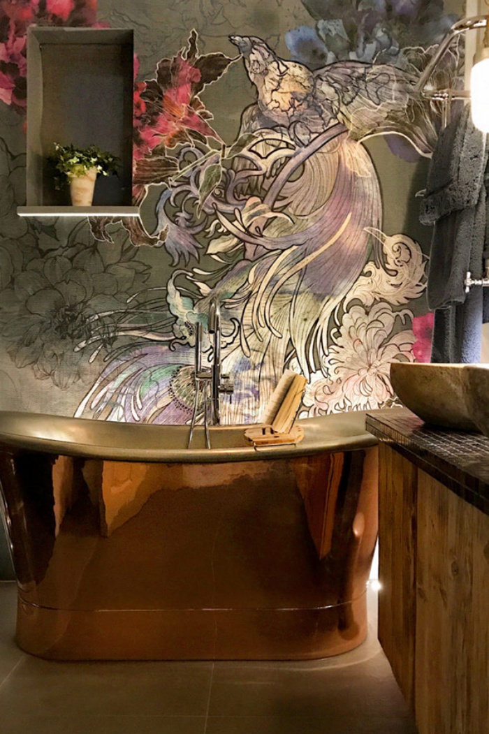 Phòng tắm vô cùng sang trọng với hoa văn nghệ thuật từ cách vẽ tường trang trí đến những hoa văn trên đường viền nội thất.